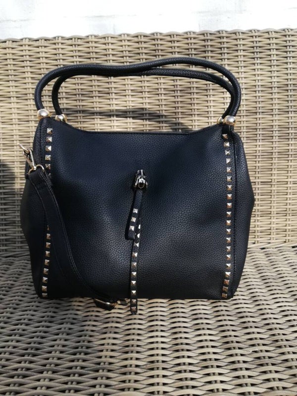 Kunstlederen handtas met mooie subtiele studs. De tas sluit met een rits, en heeft nog een extra vakje met rits op de achterzijde. Op de onderkant zitten metalen noppen, en er wordt een afneembare schouderband bijgeleverd.